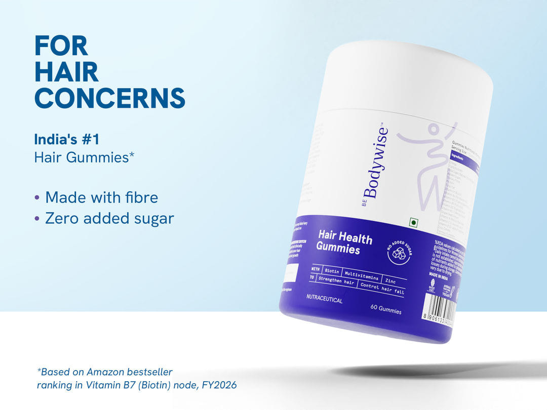 Be Bodywise Hair Gummies are packed with Biotin, Zinc & Vitamins B12, D and essential hair Multivitamins, which will give you the right nutrition to support hair strength