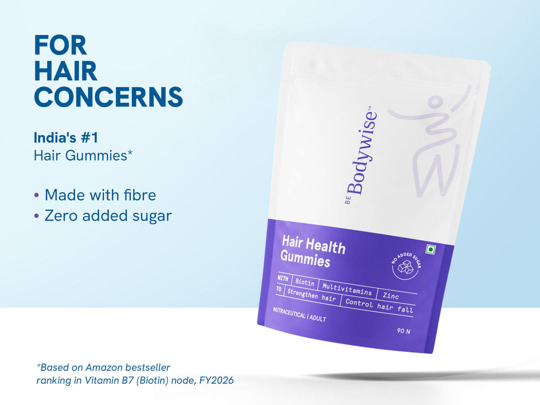 Be Bodywise Hair Gummies are packed with Biotin, Zinc & Vitamins B12, D and essential hair Multivitamins, which will give you the right nutrition to support hair strength